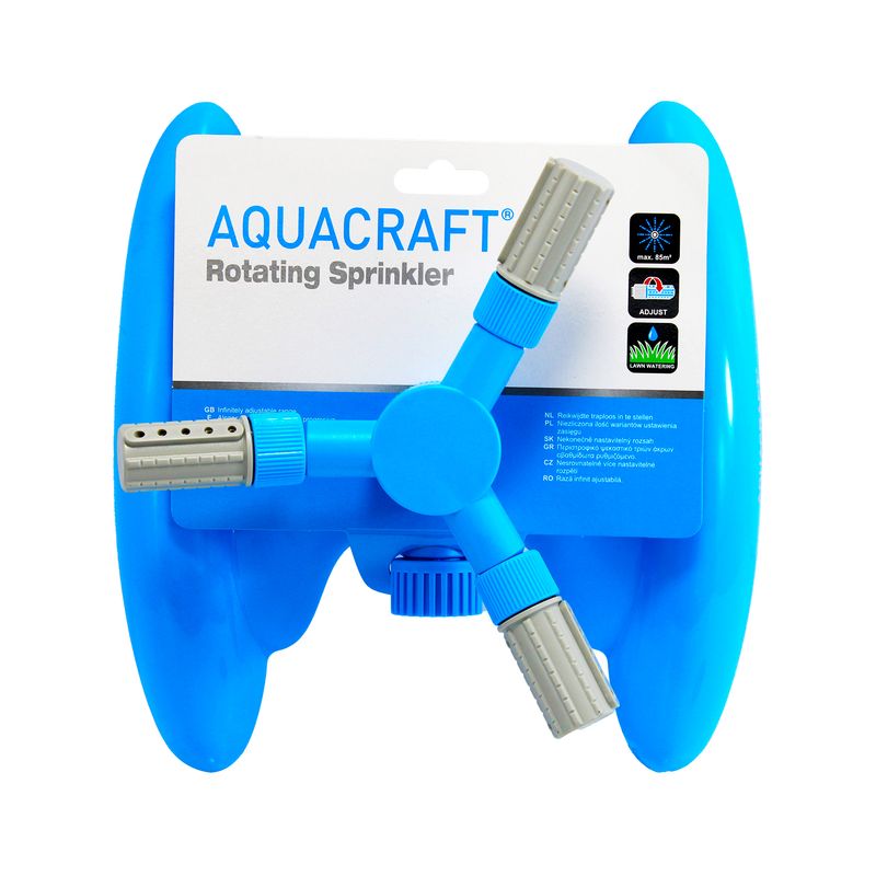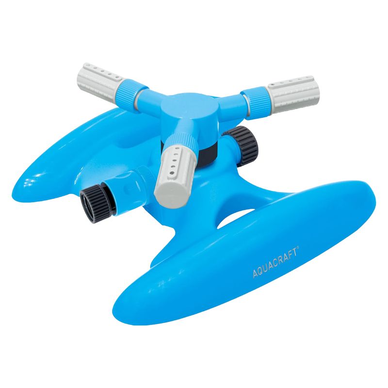 Aspersor plástico giratorio 360° con tres brazos ajustables. Diseñado para cubrir cada rincón de tu césped de manera uniforme y eficiente. Su diseño resistente y fácil de instalar garantiza un riego completo y sin esfuerzo, mientras que la movilidad de sus brazos te permite adaptar el alcance y la dirección del agua según las necesidades de tus plantas. Ideal para mantener tu jardín verde, saludable y siempre bien hidratado. Medidas del producto (Alt+Anch+Prof): 10,5 x 25 x 24 cm AQUACRAFT