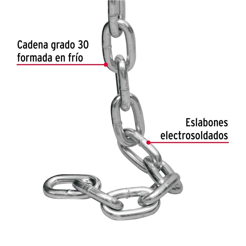 Cadena Galvanizada De 5/16" en presentación de Venta x metros. Eslabones electrosoldados para mayor resistencia. Ideal para delimitar áreas, asegurar portones y cargas ligeras. Cadena grado 30, formada en frío. Eslabones electrosoldados. Elongación mínima. Límite de carga: 862 kg. Medidas del producto (Alt+Anch+Prof): x x cm FIERO