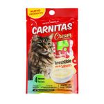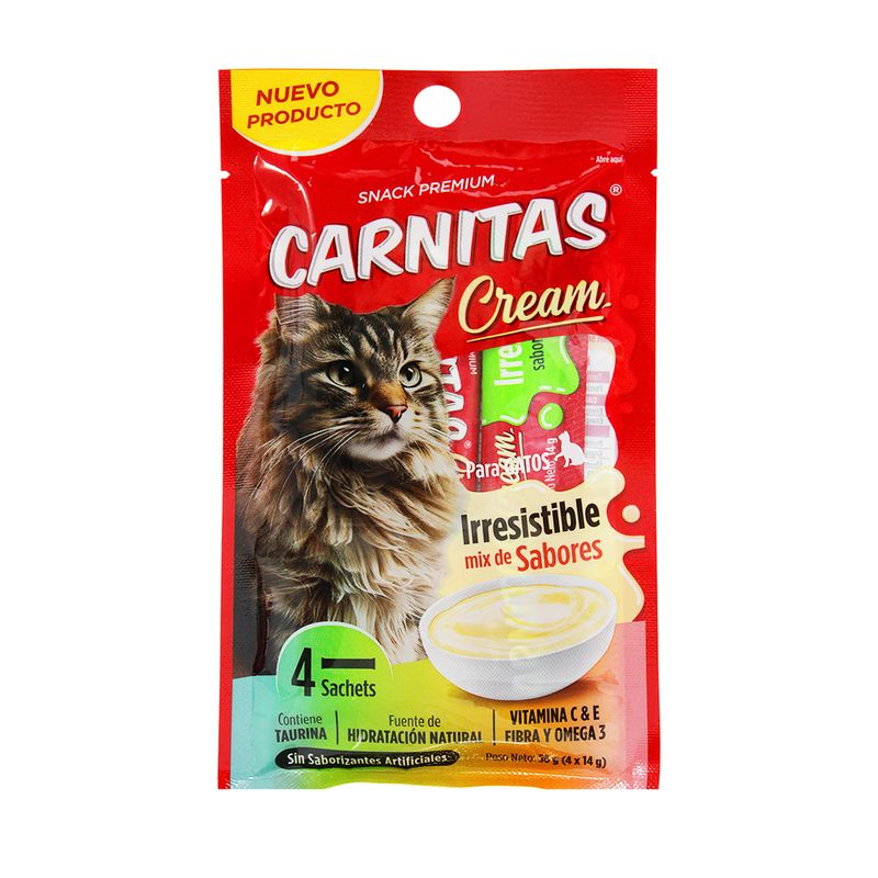 Pack de snacks para GATOS, crema de diferentes sabores, 4 sachets. Mima a tu gato con este pack de snacks en crema, irresistibles y fáciles de digerir. Incluye 4 sachets con sabores variados, enriquecidos con vitaminas C y E, fibra y omega 3 para cuidar su salud, pelaje y digestión. Un premio nutritivo y delicioso que hará feliz a tu felino en cada bocado. Medidas del producto (Alt+Anch+Prof): 21 x 11,5 x 2 cm CARNITAS
