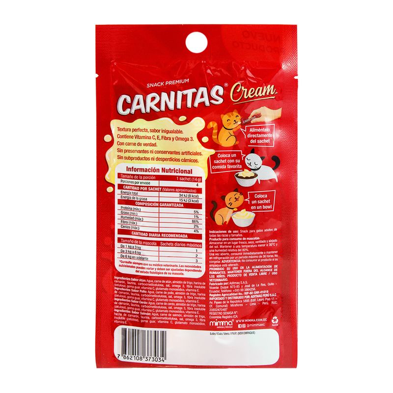 Pack de snacks para GATOS, crema sabor a ATÚN, 4 sachets. Mima a tu gato con este pack de snacks en crema, irresistibles y fáciles de digerir. Incluye 4 sachets con sabor a atún, enriquecidos con vitaminas C y E, fibra y omega 3 para cuidar su salud, pelaje y digestión. Un premio nutritivo y delicioso que hará feliz a tu felino en cada bocado. Medidas del producto (Alt+Anch+Prof): 21 x 11,5 x 2 cm CARNITAS