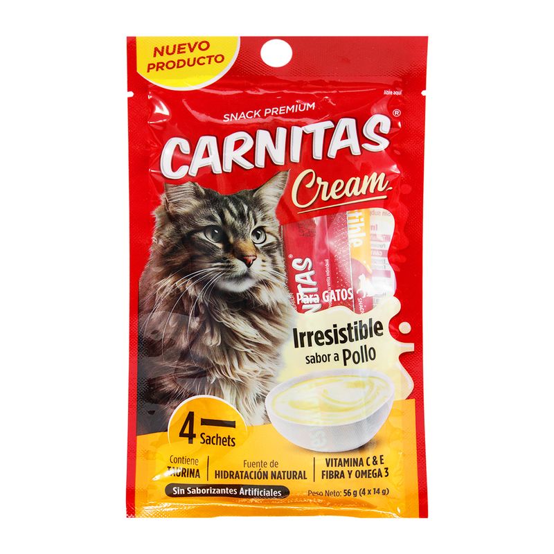 Pack de snacks para GATOS, crema sabor a POLLO, 4 sachets. Mima a tu gato con este pack de snacks en crema, irresistibles y fáciles de digerir. Incluye 4 sachets con sabor a pollo, enriquecidos con vitaminas C y E, fibra y omega 3 para cuidar su salud, pelaje y digestión. Un premio nutritivo y delicioso que hará feliz a tu felino en cada bocado. Medidas del producto (Alt+Anch+Prof): 21 x 11,5 x 2 cm CARNITAS