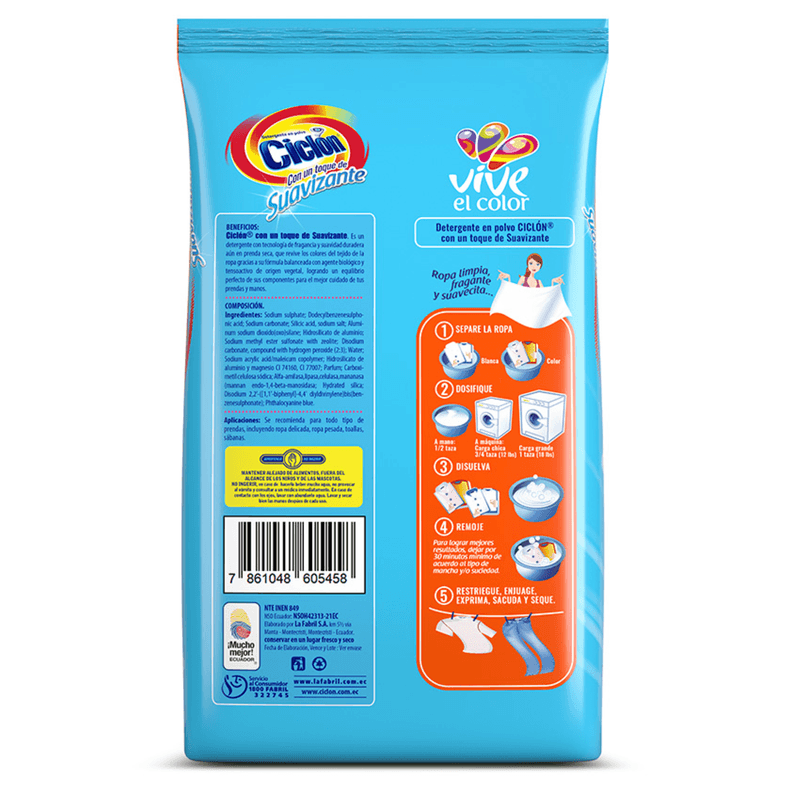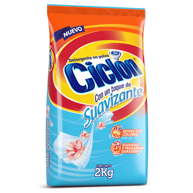 Detergente en polvo blanco con un toque de SUAVIZANTE que revive los colores de todo tipo de prendas y brinda una fragancia y suavidad duradera. Ideal para lavado de ropa a mano o a máquina. Medidas del empaque: 12 x 40 x 20 cm. Peso: 2 kg. CICLON