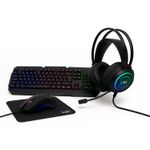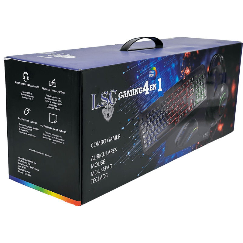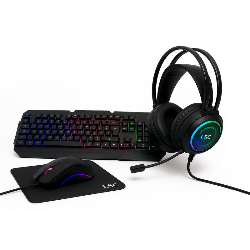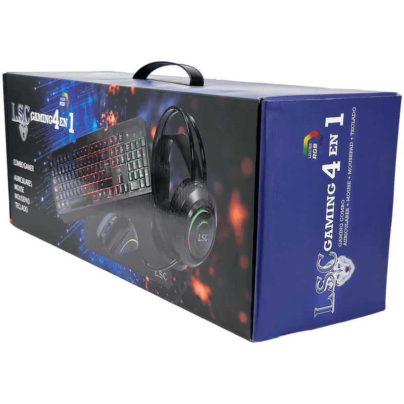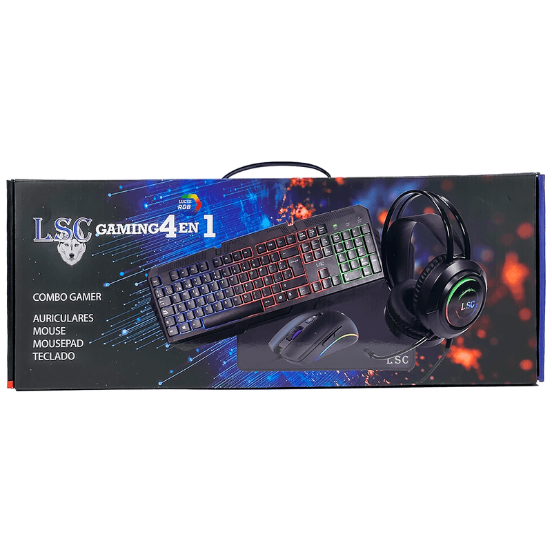 Combo Gamer que incluye: Teclado, Mouse, Audífonos y Mouse Pad; estilo, precisión y confort. Set gamer todo en uno: teclado LED, mouse ergonómico de alta precisión, auriculares con sonido envolvente y mouse pad de deslizamiento suave, combinando estilo, comodidad y rendimiento profesional. Medidas del producto (Alt+Anch+Prof): 14 x 11 x 2 cm LSC