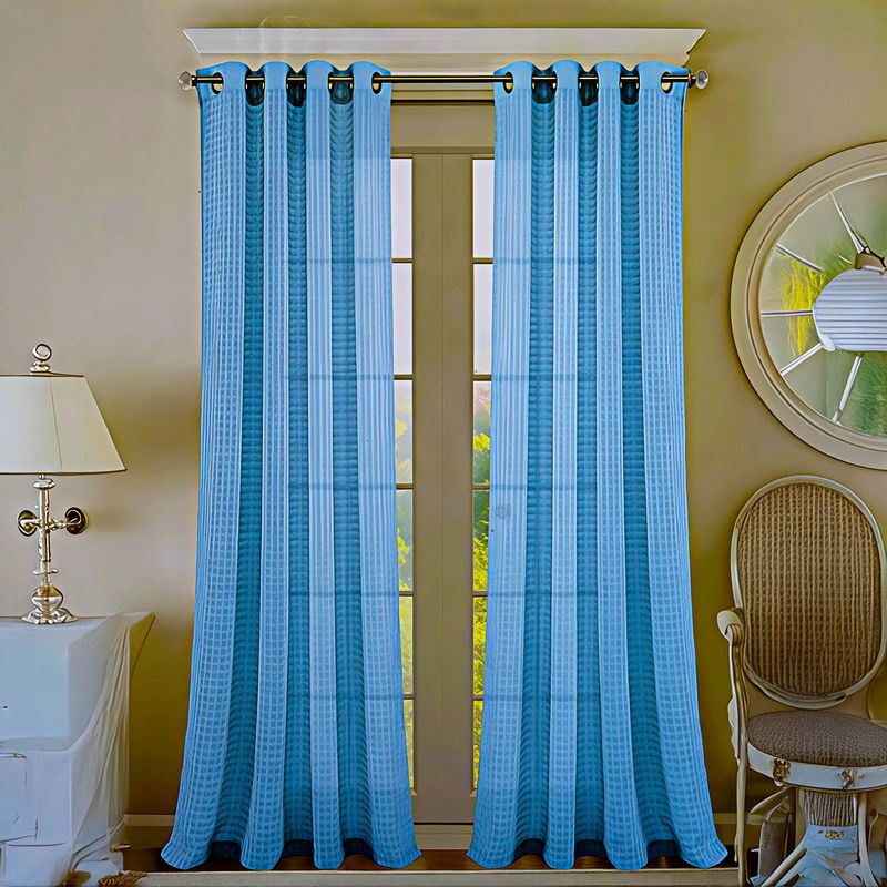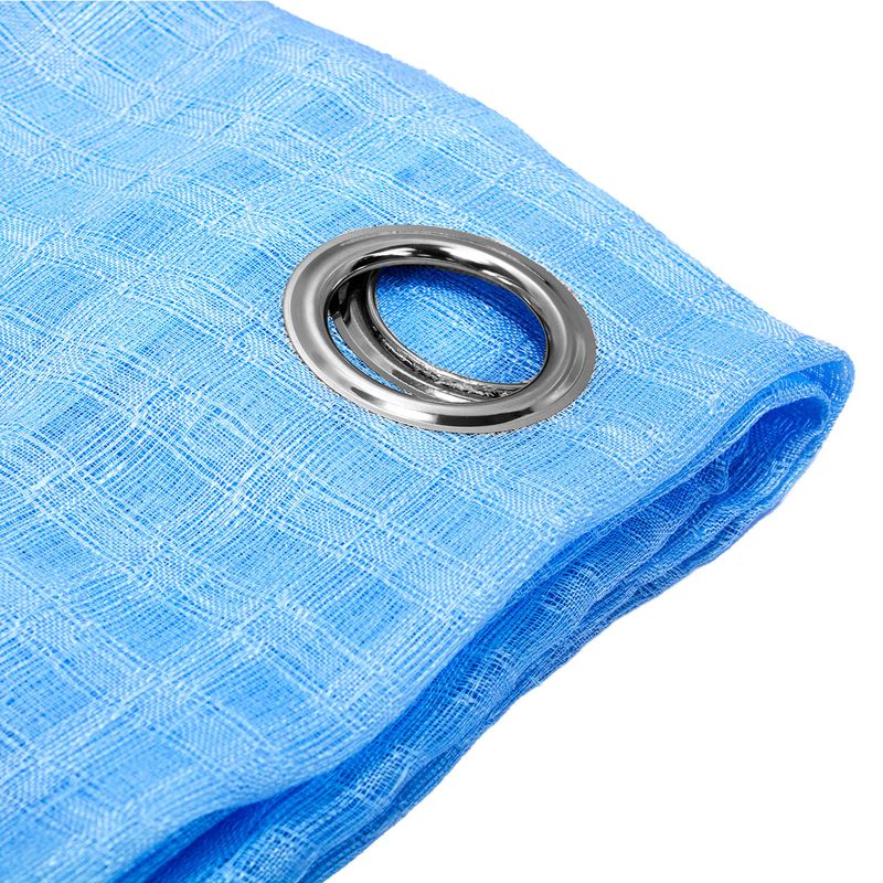 Cortina visillo color celeste transparente de 54" x 90". Ideal para cualquier espacio. Con un panel extra ancho y ojales metálicos, es fácil de instalar y se adapta a barras estándar o decorativas. Además, es lavable en lavadora y requiere poco mantenimiento, lo que la convierte en una opción práctica y duradera. Disponible en diversas opciones de decoración para complementar cualquier estilo. Medidas del producto (Alt+Anch+Prof): 228 x 137 x 0,2 cm PALM SPRINGS HOMES