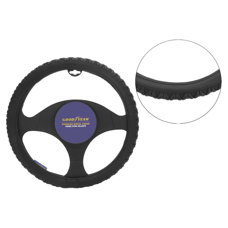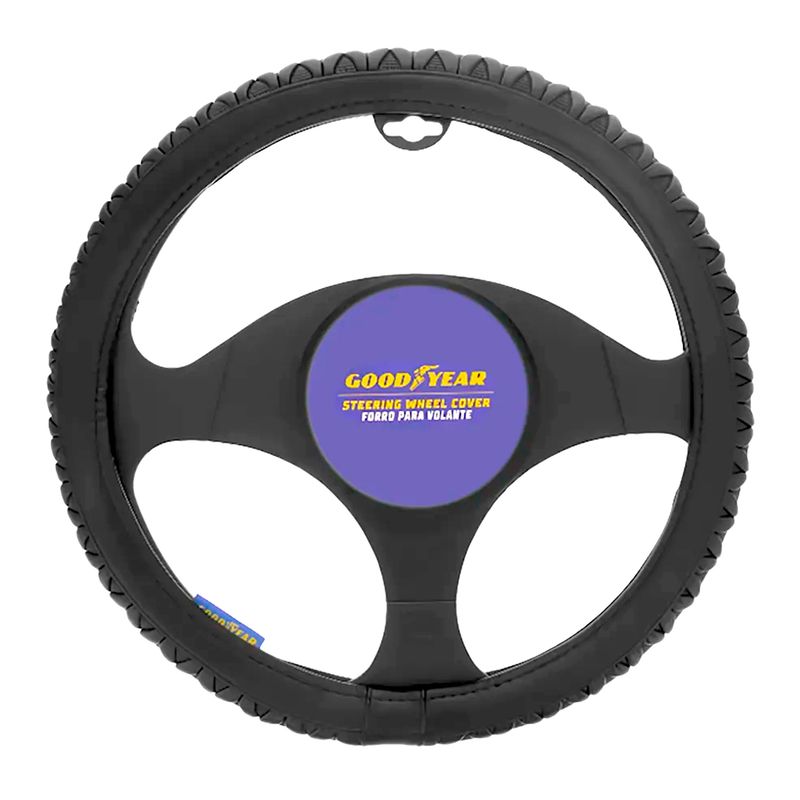 Forro para volante color negro con diseño tejido. Combina resistencia y suavidad al tacto. Su ajuste firme garantiza un mejor agarre al conducir, mientras protege el volante original del desgaste y eleva la apariencia del interior de tu auto Medidas del producto (Alt+Anch+Prof): 39 x 39 x 3,5 cm GOOD YEAR