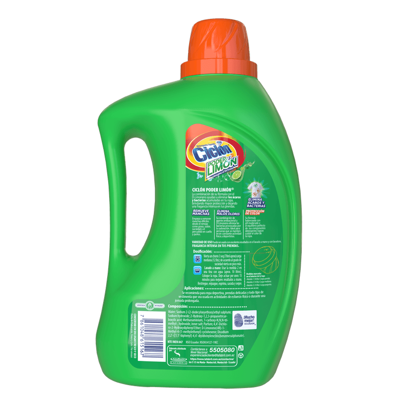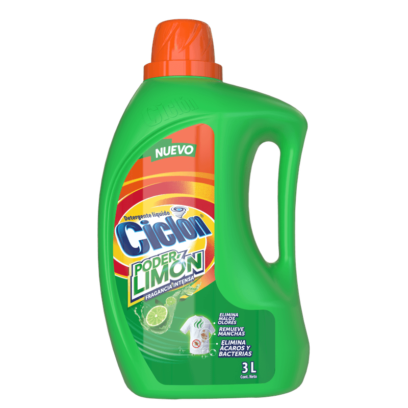 Detergente líquido con fragancia intensa a limón 3 lts. Elimina malos olores, remueve manchas difíciles y combate ácaros y bacterias, dejando tu ropa impecable y protegida. Su fórmula avanzada cuida los colores y mantiene las prendas como nuevas por más tiempo. Ideal para una limpieza eficaz con un aroma que perdura. Medidas del producto (Alt+Anch+Prof): 31 x 18 x 11 cm CICLÓN