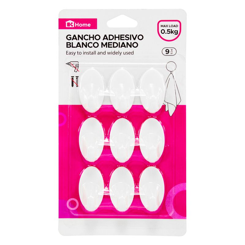Gancho adhesivo blanco pequeño con 500 gr de capacidad de carga Pack x 9 unidades. Ideal para colgar objetos livianos como toallas, llaves o accesorios. Hechos de plástico blanco resistente, ofrecen un diseño discreto y funcional para mantener tus espacios ordenados. Perfectos para hogares, oficinas o cualquier lugar donde necesites una solución fácil y segura. Medidas del producto (Alt+Anch+Prof): 3,5 x 2 x 1,5 cm K HOME