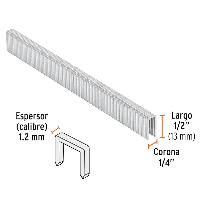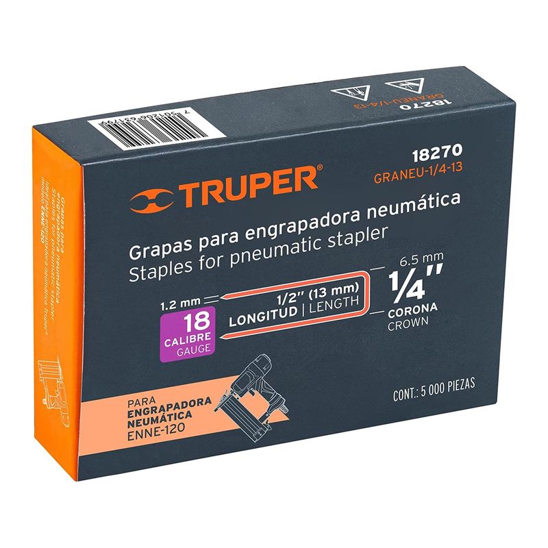 Caja con 5000 grapas calibre 18 con longitud de 1/2" -13 mm con CORONA de 1/4". Ideales para proyectos de tapicería, construcción ligera y ensamblaje de marcos de madera. Fabricadas en acero con un espesor de 1.2 mm (cada grapa). Compatibles con la engrapadora neumática ENNE-120. Para SKU: 579006. Totalmente compatibles con otras marcas del mercado. Medidas del producto (Alt+Anch+Prof): x x cm TRUPER