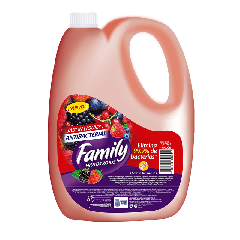Jabón líquido rojo antibacterial con glicerina y aloe vera; que ayudan a proteger e hidratar la piel de las manos, dejando un agradable aroma a FRUTOS ROJOS libre de parabenos. Elimina el 99.9% de virus y bacterias. Medidas del empaque: 9 x 30.5 x 22 cm. Peso: 3.94 kg. 1 gl FAMILY