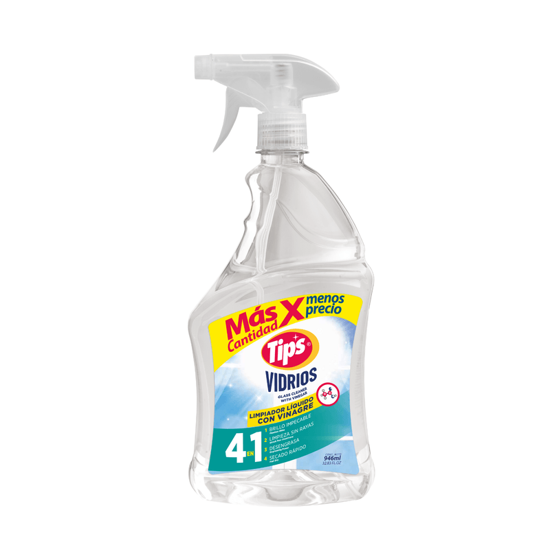 Limpia vidrios transparente Limpia vidrios 4 en 1. Limpiador líquido con vinagre. Brillo impecable. Limpieza sin rayas. Desengrasa, rápido secado. Elimina impurezas y resíduos sobre superficies lavables. Para uso sobre ventanas, espejos, autos, vitrinas, etc. 946 ml TIPS