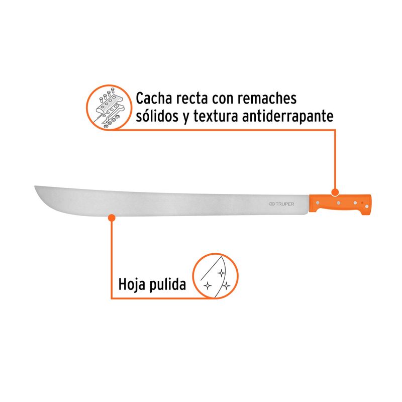 Machete de 24" con hoja de acero al carbono con cacha plástica. Machete de 24 pulgadas con hoja de acero al carbono tratada térmicamente para mayor flexibilidad y resistencia. Mango ergonómico de plástico para un agarre cómodo y seguro. Cacha recta con remaches sólidos y textura antiderrapante. Medidas del producto (Alt+Anch+Prof): x x cm TRUPER