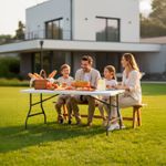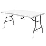 Mesa plástica, plegable, para uso en interiores o exteriores. Acabado blanco. Estructura metálica.