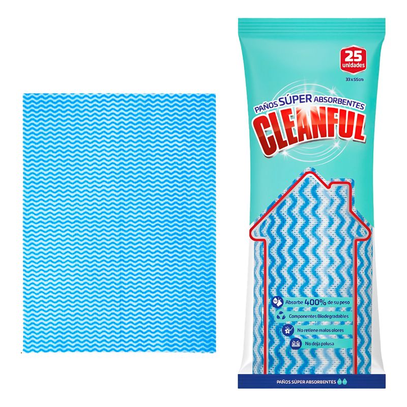 Paño absorbente no tiene malos olores, no deja pelusa, para todas las superficies. Rollo grande 33 x 55 cm, ideal para limpiar cualquier superficie sin dejar pelusa ni malos olores. Su alta capacidad de absorción lo convierte en el aliado perfecto para el hogar, cocina u oficina. Resistente, práctico y duradero, ofrece una limpieza impecable y rápida en cada uso. Medidas del producto (Alt+Anch+Prof): 32,5 x 9 x 9 cm CLEANFUL