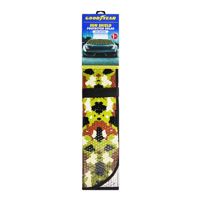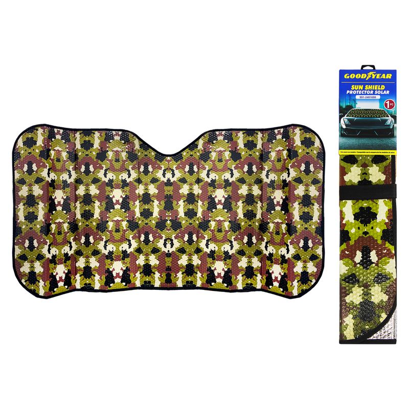 Parasol color CAMUFLAJE VERDE de 140 x 70 , para auto, incluye ventosas. Protege tu vehículo del calor y los rayos UV con este elegante parasol clamuflaje de 140 x 70 . Su diseño práctico y moderno mantiene el interior fresco, cuida el tablero y asientos, y se instala fácilmente en el parabrisas. Ideal para quienes buscan estilo y protección en un solo accesorio. Incluyen ventosas. Medidas del producto (Alt+Anch+Prof): 70 x 140 x 0,7 cm GOODYEAR