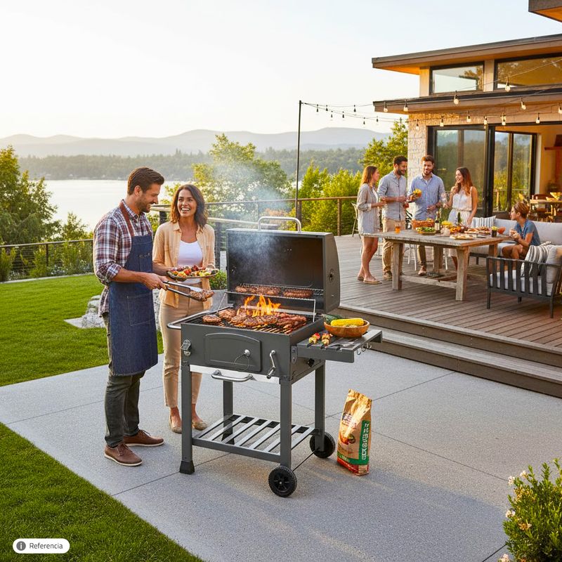 Parrila de carbón de 1 mesa con estructura de acero reforzado. Cuenta con una parrilla principal de hierro forjado, una parrila ahumadora, un indicador de temperatura y una bandeja de carbón modificable en altura. Incluye 4 ganchos, 1 destapador de botellas y 2 llantas. Medidas del producto (Alt+Anch+Prof): 105 x 103 x 64 cm K PRO