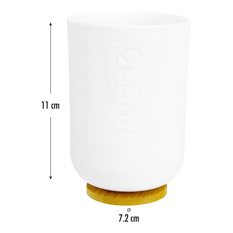 Vaso porta cepillos con base de bambú y cuerpo plástico blanco. Diseñado para dar un toque natural y moderno a tu baño. Perfecto para mantener organizados tus cepillos de dientes y pasta dentífrica, combina practicidad y estilo en un solo accesorio. Medidas del producto (Alt+Anch+Prof): 11 x 7,2 x 7,2 cm ORGILL