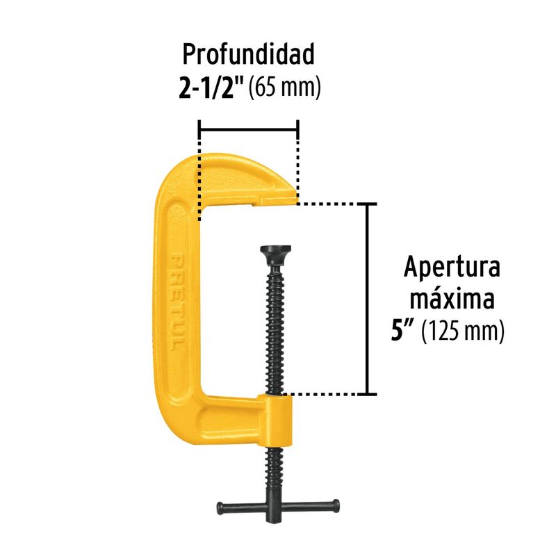 Prensa en C de 5" de hierro dúctil para carpintería. Cuerpo de hierro para mayor resistencia. Mordazas grandes que proporcionan mayor estabilidad. Apertura máxima de 5". Ideal para carpintería. Profundidad: 2-1/2" (65 mm). Medidas del producto (Alt+Anch+Prof): x x cm PRETUL
