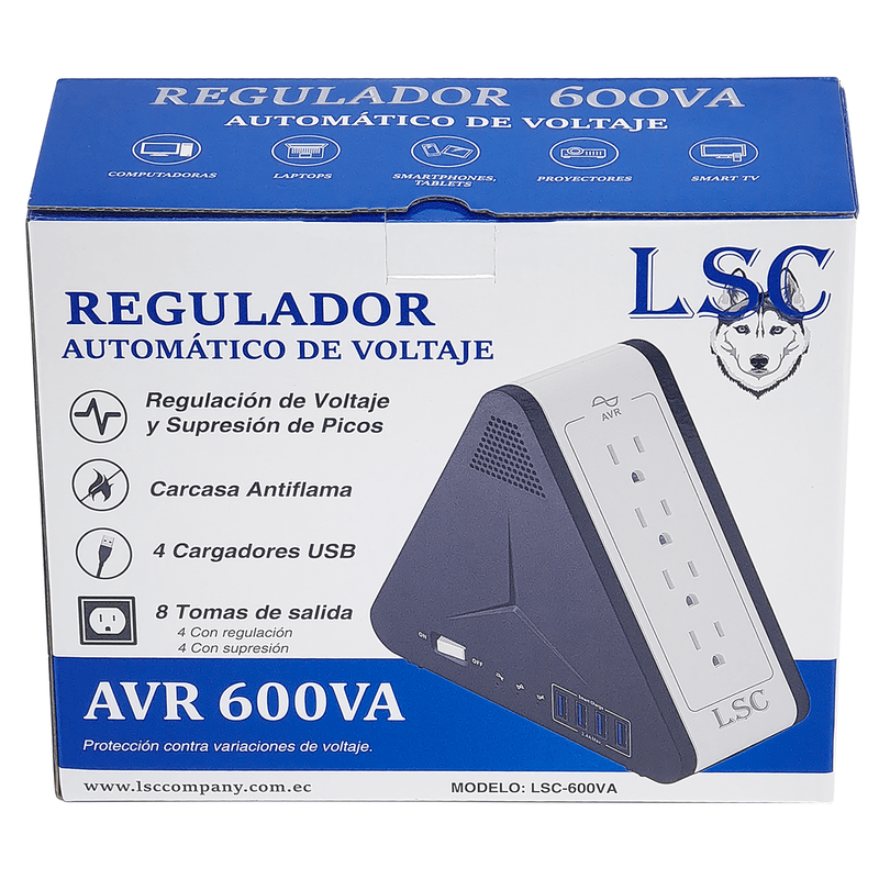 Regulador de voltaje 600VA + 4 puertos USB para proteger equipos y cargar dispositivos. Con 8 salidas protegidas (4 con regulación de voltaje y 4 con supresion de picos), este regulador de 600 VA / 300W mantiene sus equipos seguros ante variaciones eléctricas. Además, incorpora 4 puertos USB para cargar celulares y tabletas sin ocupar enchufes. Ideal para oficinas, escritorios y estaciones de trabajo modernas Medidas del producto (Alt+Anch+Prof): 16 x 18 x 7 cm LSC