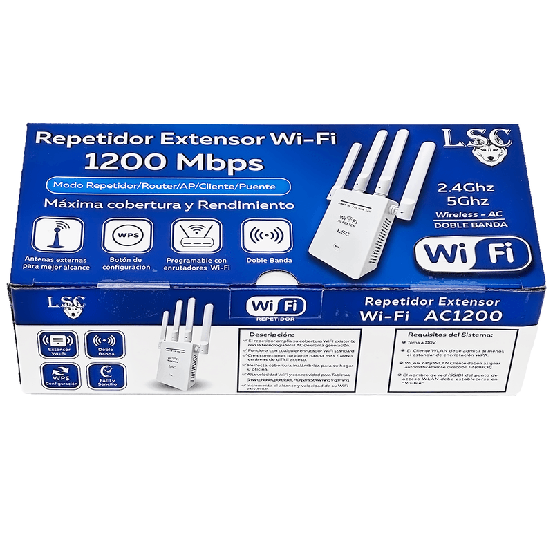 Repetidor Extensor WiFi 1200 Mbps para conexiones rápidas y confiables con bandas de 2,4 GHz y 5 GHz. Solución perfecta para eliminar zonas sin señal en tu hogar u oficina. Con tecnología de doble banda, garantiza mayor velocidad, estabilidad y una conexión fluida incluso cuando varios dispositivos están conectados al mismo tiempo. Su instalación es rápida y sencilla: solo conéctalo a un enchufe y sigue unos pasos básicos para disfrutar de internet en cada rincón. Medidas del producto (Alt+Anch+Prof): 20 x 10 x 5,5 cm LSC