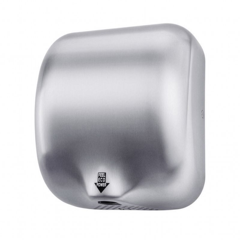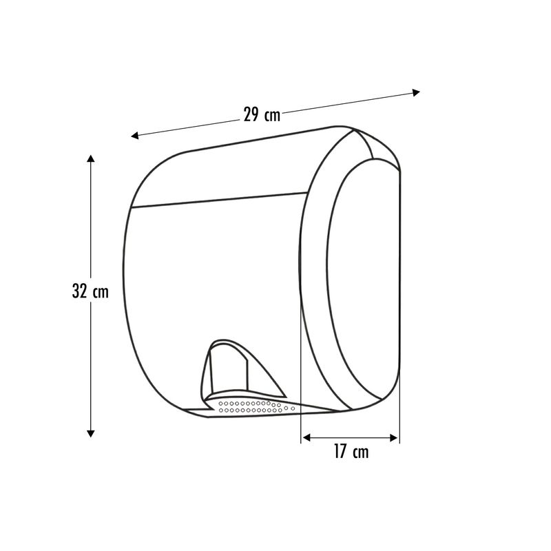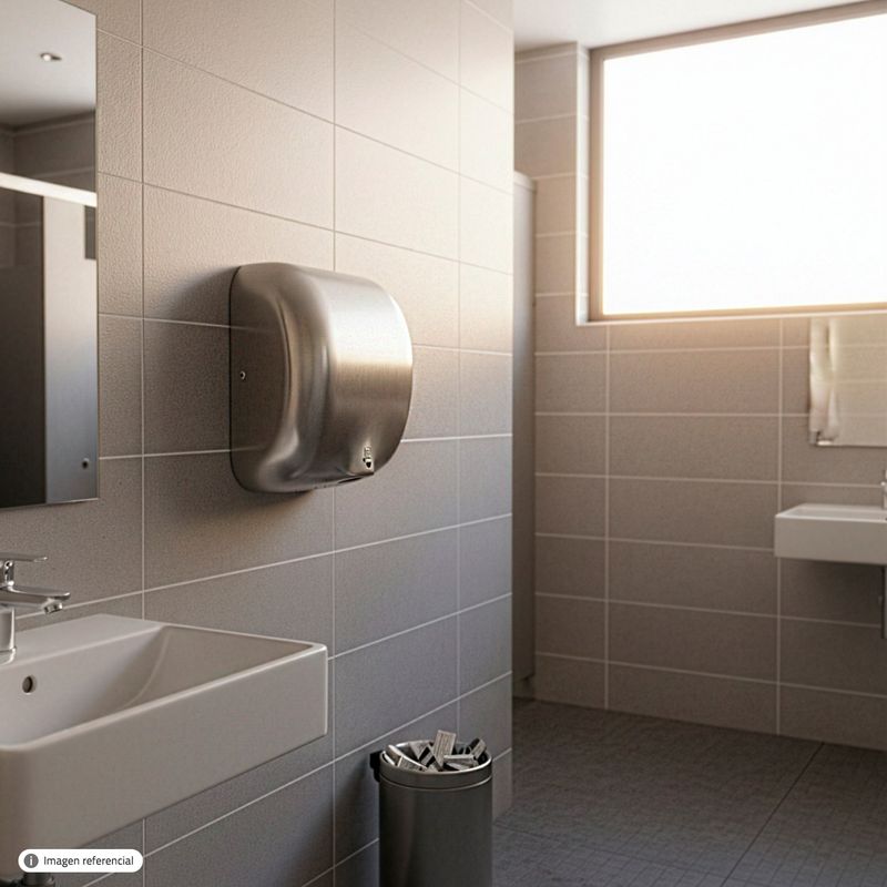 Secador de manos automático de 1800W de acero inoxidable con cubierta anti-vandalismo 110V - 120V. Secador de manos automático anti-vandalismo de 1800 W con cubierta de acero inoxidable cepillado/mate. Ofrece un flujo de aire de 140 m³/h. El nivel de ruido es de 74 dB (a 1 metro). Ideal para uso en entornos de alto tráfico como hoteles o baños públicos. Incluye cable eléctrico de 165 cm aproximadamente, con toma tipo B de conexión directa a tomacorriente. Tiempo de secado: 8 - 10 segundos. Rango de sensor de proximidad: 5 - 15 cm. Aislamiento Eléctrico: Clase 1. Motor: 22000 RPM. Velocidad de aire: 100 m/s. Medidas del producto (Alt+Anch+Prof): 32 x 29,5 x 18,4 cm WRT