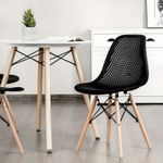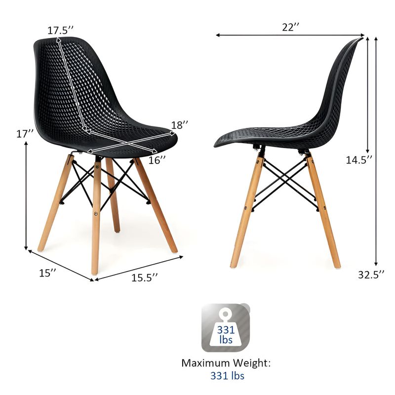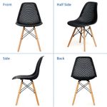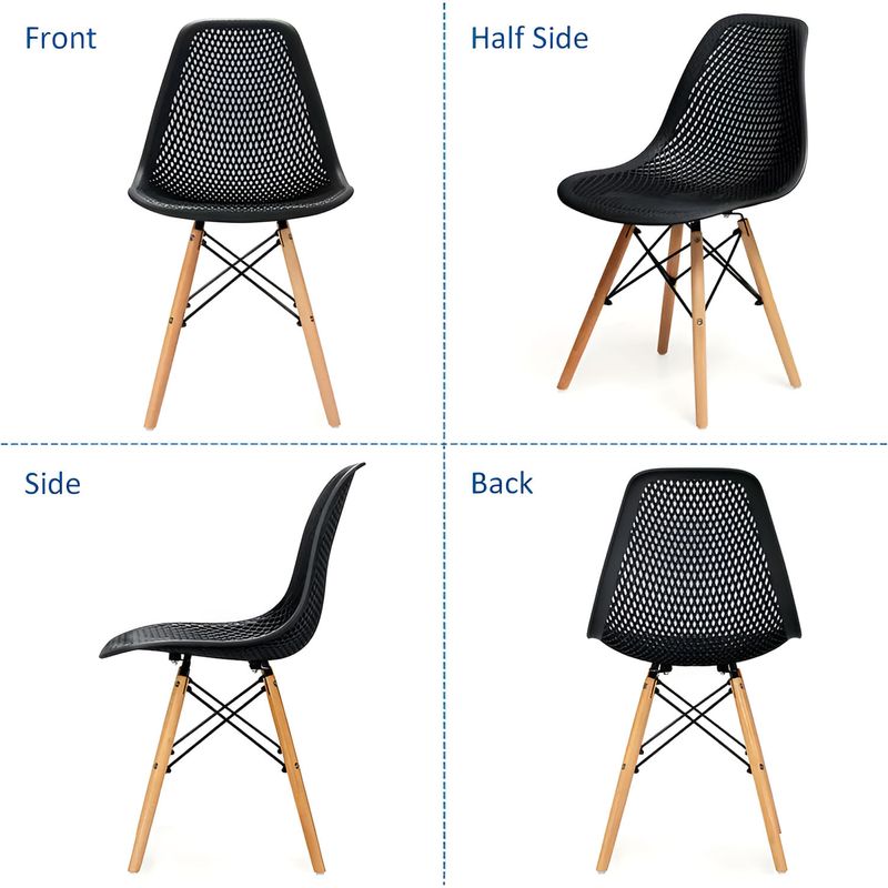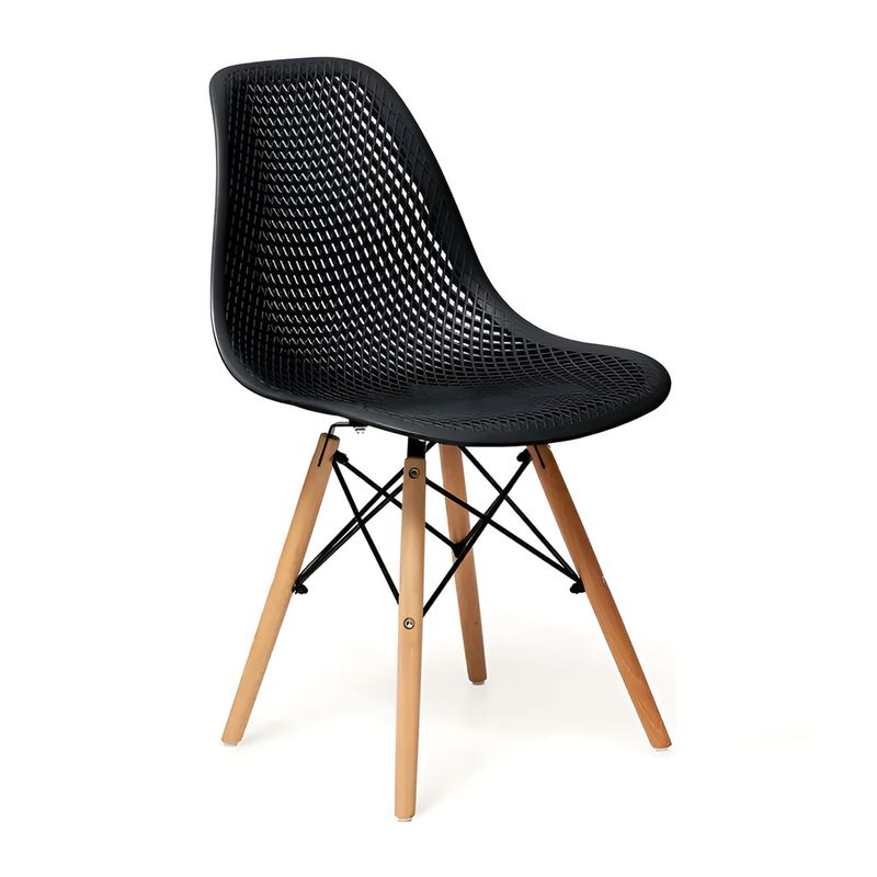 Silla "EFEEL" perforada tipo rombos con patas de madera y soporte de acero color negro. Cuenta con patas de madera que brindan estabilidad y un toque de elegancia, mientras que su estructura metálica de varillas garantiza resistencia y durabilidad. El diseño perforado del asiento proporciona comodidad y ventilación, haciendo de esta silla una opción ideal para espacios modernos y de uso frecuente. Medidas del producto (Alt+Anch+Prof): 81 x 45 x 52 cm WRT