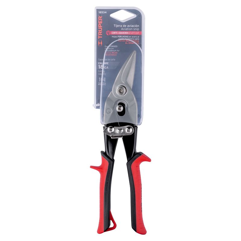 Tijera de aviador de 10" CORTE IZQIUERDO con hojas forjadas de acero al cromo molibdeno. Ideal para cortar cobre, acero y acero inoxidable. Mangos ergonómicos confortables de color rojo para fácil identificación del tipo de corte (izquierdo). Recubrimiento niquelado para mayor resistencia a la corrosión. Medidas del producto (Alt+Anch+Prof): x x cm TRUPER