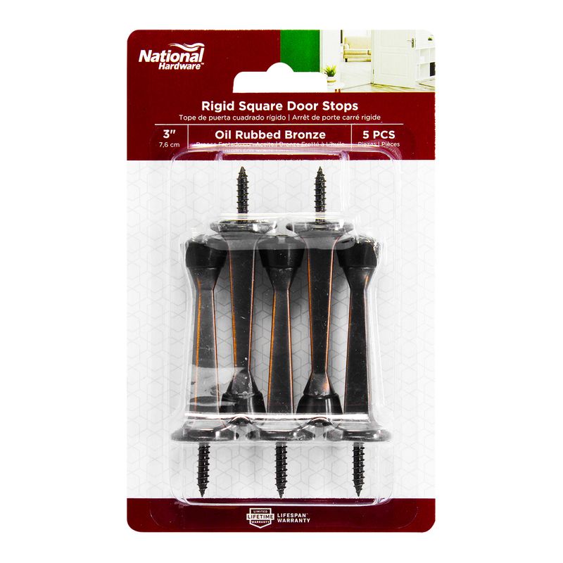 Tope de puerta rígido de 3" color bronce en set de 5 unidades. Diseñados para mantener tus puertas firmes y evitar golpes indeseados en paredes o muebles, combinan durabilidad y estilo, ofreciendo una solución práctica y estética para cualquier hogar u oficina. Medidas del producto (Alt+Anch+Prof): 2,3 x 7,6 x 2,3 cm NATIONAL HARDWARE