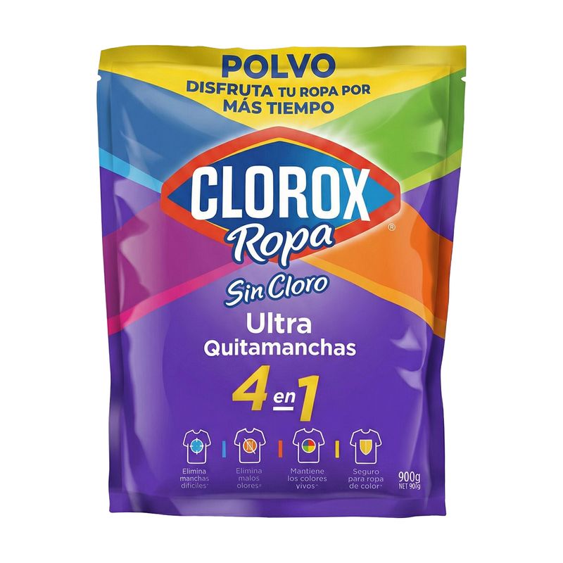 Ultra quitamanchas en polvo para ropa 4 en 1 sin cloro. Combate la suciedad más incrustada sin dañar los tejidos. Este tratamiento avanzado no solo elimina las manchas difíciles y neutraliza los malos olores, sino que también protege y revive la intensidad de los colores, garantizando una limpieza profunda y segura para toda tu ropa de color en cada lavado. Ⓘ Imágenes referenciales. Medidas del producto (Alt+Anch+Prof): 24 x 19 x 7 cm CLOROX