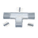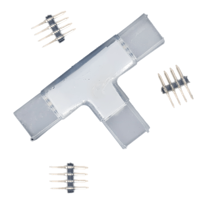 Unión en T de 4 Pines para Manguera LED RGB 5050 diseñado para dividir o unir 3 tramos de manguera. Ideal para extender la iluminación en tres direcciones, permitiendo uniones horizontales y verticales en una sola conexión. Fabricada en PVC duradero y Pines de cobre Medidas del producto (Alt+Anch+Prof): 14 x 11 x 1 cm LSC