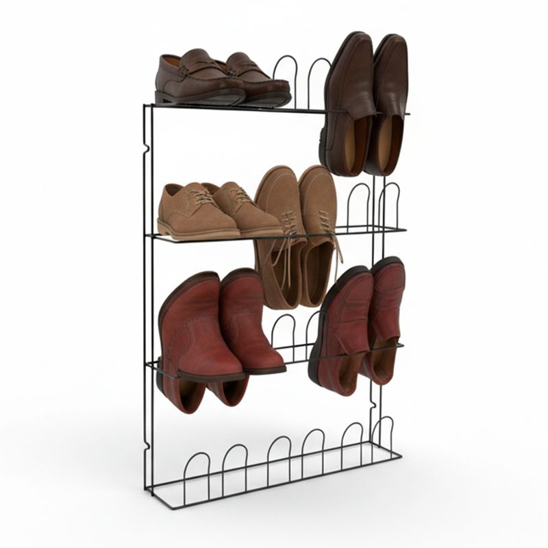 Zapatera de 12 pares para pared . Fabricada en varilla de 4,8 con alambre # 11 recubierta con pintura electrostatica con las siguientes medidas de 60 cm de ancho x 86cm de alto x 13cm de fondo.
